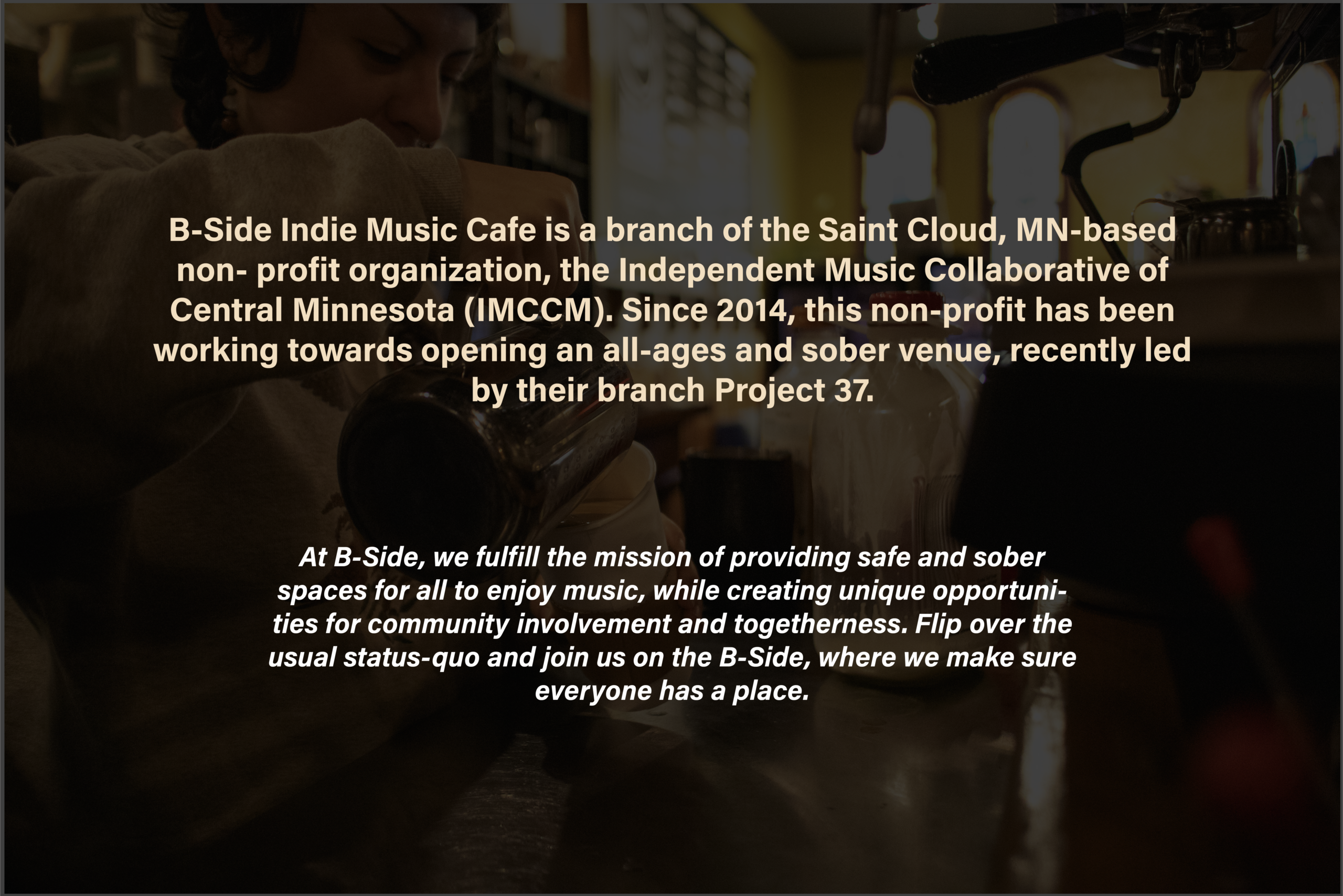 Here at B-Side, we aim to be a "third space" for our community. As a sober and all ages friendly space, we want to be a hub of activity for central Minnesotans. We are a great meeting space for friends, clubs, and other gatherings!